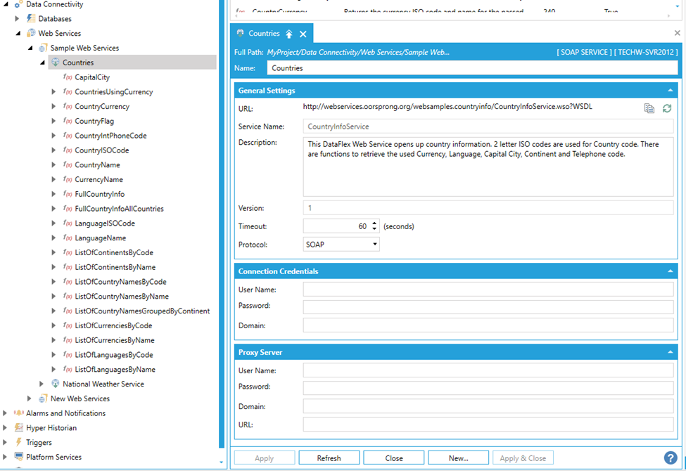 To connect to a SOAP Service, you have to enter the URL of its WSDL document and give a name to the service. Then click the Apply button and Workbench will automatically download the WSDL file and create Web Methods for all the methods exposed by the service. You may notice some additional sub-branches, representing the methods exposed by the service, added beneath newly added Web Service within the Project Explorer as shown below.