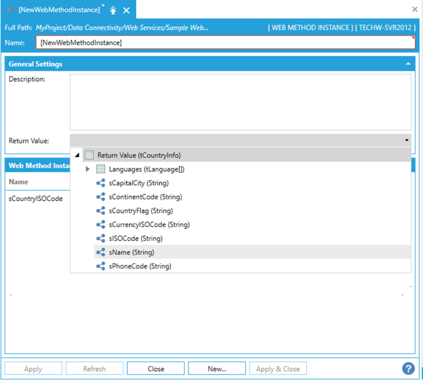 In the General Settings section, you can enter a Description for the Web Method Instance. You can also drill into the method’s result using the Return Value combo-box. Selecting a property from the Return Value combo-box will pin the result of the Web Method Instance to that property, and everything at a higher level will be inaccessible.