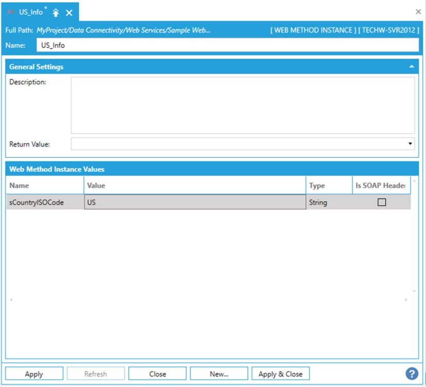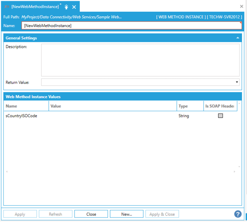 Once you have completed making edits to the Web Method Instance, click Apply to save your settings and Close to exit.