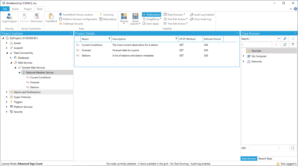The Web Services Provider within the Workbench, shown below, acts as a configurable data source, similar to how data is provided to the HMI/SCADA suite via other data connectors including OPC, BACnet, SNMP or other data sources.