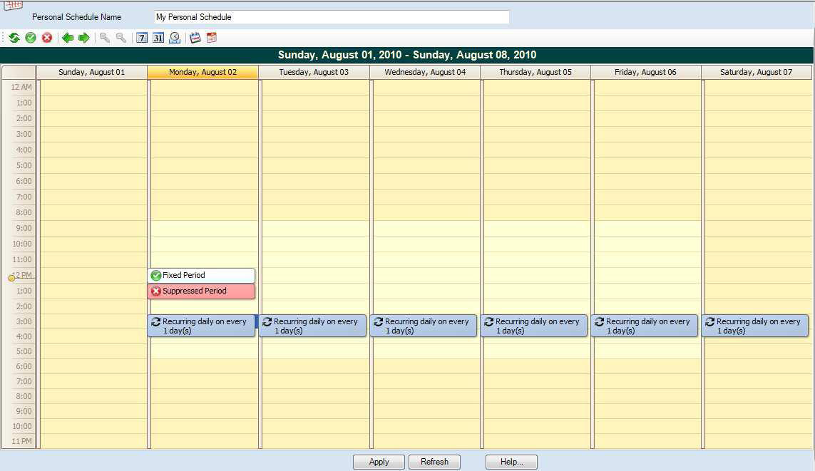Double-click into the calendar and select one of the three options on the toolbar to create the schedule. You create the schedule by adding recurringperiods, fixedperiods, and suppressed time periods. To see a calendar with examples, .
