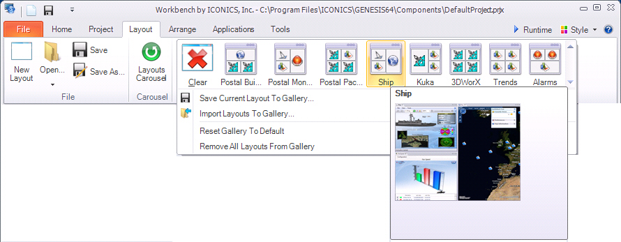 On the Workbench Classic's Layout ribbon, the Layouts Carousel is identical to the tool used to display GraphWorX64 files. It provides a time dependent ordered slide show of the displays contained in the layouts you specify. The carousel stores the play list of your files in an XML file with the replay parameters, including: the time each display is shown, a randomize or repeat function, and manual controls for navigating the play list. GENESIS64 differentiates the XML file used for GraphWorX64 display play lists from Workbench Classic layout play lists, manner in which the Layout Carousel uses the stored data is identical to the way that the GraphWorX64 XML data is used even though different data is stored for that XML file.