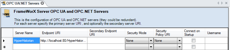 Connect on Startup: flag saying whether the OPC UA server will be automatically connected to the FrameWorX Server (default is false).