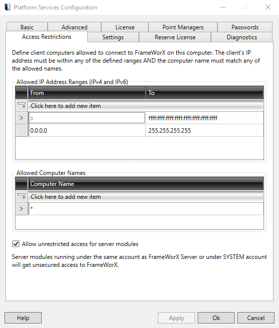 The Access Restrictions tab allows users to define which client computers are allowed to connect to the FrameWorX Server. Clients from other nodes will not be allowed. The client computer must match both lists: the Allowed IP Address Ranges (IPv4 and IPv6) and the Allowed Computer Names. Use * for any name. Use IPv4 and IPv6 addresses (Windows uses IPv6 internally). All clients are allowed by default.