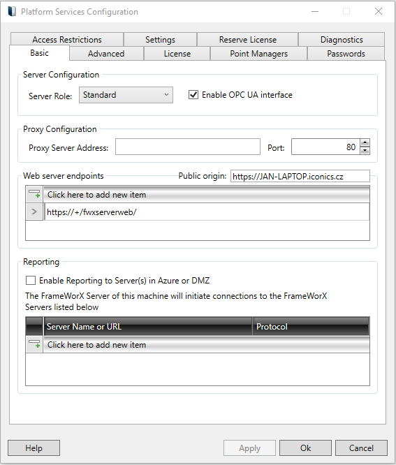 Platform Services Configuration - Basic Tab