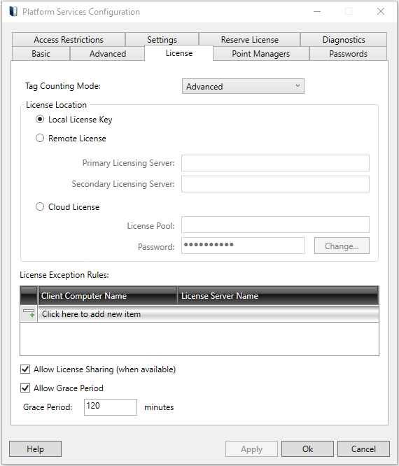 On the License tab, specify the server's licensing by choosing either Local License key (for the server to use its local license), Remote License (for the server to get a license from another FrameWorX Server) or Cloud License (for the server to use a cloud-based license).
