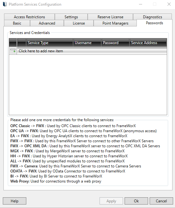 The Passwords tab allows users to specify credentials for different modules to connect to various servers. Currently, FrameWorX Servers and OPC XML DA servers are supported. Use * for the credentials to be used for all target addresses. These credentials are used for the modules running on the local computer.