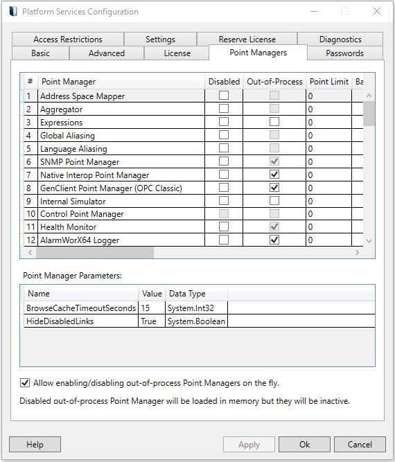 The Point Managers tab of the Platform Services Configuration window allows you to Disable/Enable and/or set "Out-of-Process" status for specific point managers for multiple integrated data components (aggregators, aliases, data connectors, databases, histories, etc). Point Managers are plug-in modules running within the process of a FrameWorX Server. They may be disabled when their functionality is not needed, in order to minimize the FrameWorX Server’s memory footprint or for troubleshooting. Also, they may be set up to run out-of-process. Then, they run in a separate process but there is a slight performance hit when running out-of-process.