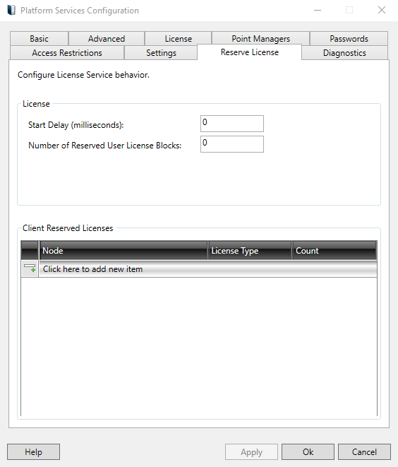 Reserve License Tab in the Platform Services Configuration Window