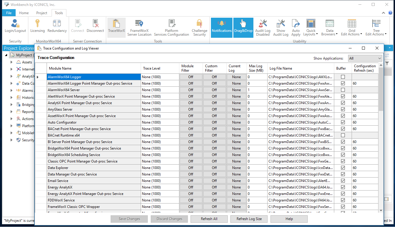 TraceWorX can also be accessed as a separate application via C:\ProgramData\Microsoft\Windows\Start Menu\Programs\ICONICS\Tools\TraceWorX.lnk or C:\Program Files\ICONICS\GENESIS64\Components\IcoTraceConfiguratorApp.exe.