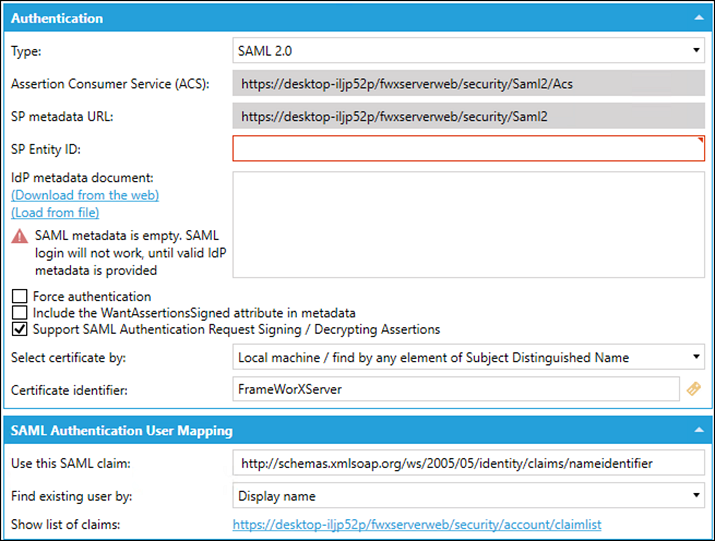 Select SAML 2.0 to show all required SAML authentication information. |