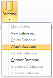 Database button in the Home ribbon at the top of the Workbench64 screen and select "Attach Database". Other menu options using this method include "Make Active", "New Database", "Delete Database", "Detach Database", "Connect Database", "Disconnect Database" or "Upgrade Database"
