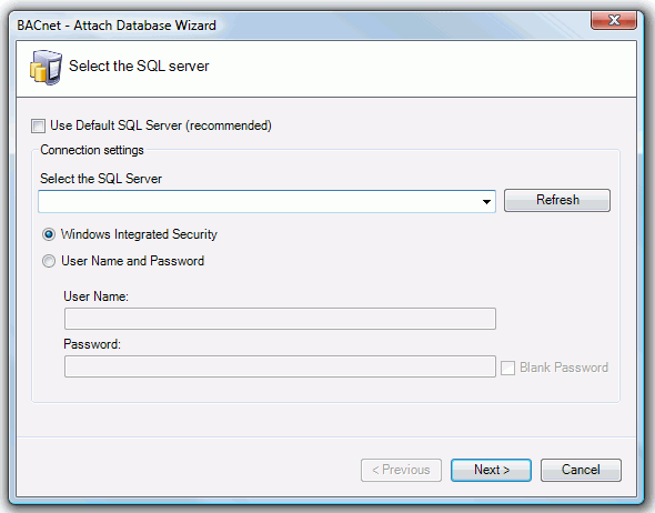 This will bring up the BACnet-Attach Database Wizard. You have the option of selecting the Default SQL Server (checked by default). Should you deselect the checkbox, in order to enter your own connection settings, you can then select the SQL Server via a pulldown menu and then decide upon using Windows Integrated Security or providing a specific User Name and Password. Make you selection then click Next to proceed.