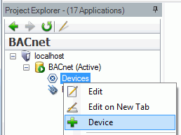 1. ClosedRight-click on the Devices branch of the BACnet Connector Project Explorer in Workbench64, then click on Device.