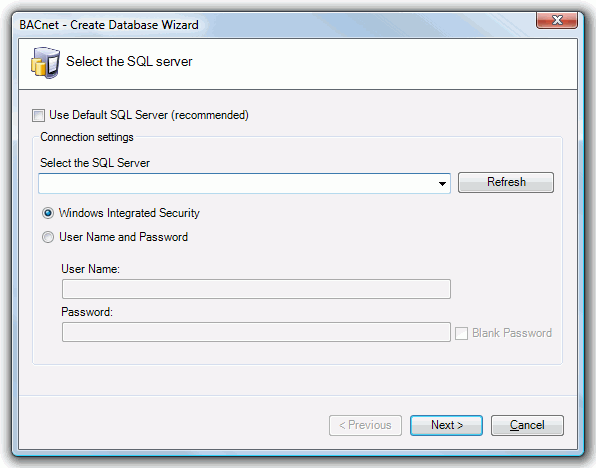 This will bring up the BACnet-Create Database Wizard. You have the option of using the Default SQL Server (the checkbox is checked by default). If you deselect this option, you can proceed in setting new connection settings. Select the SQL Server via a pulldown menu and then decide upon using Windows Integrated Security or providing a specific User Name and Password. Make your selection then click Next to proceed.