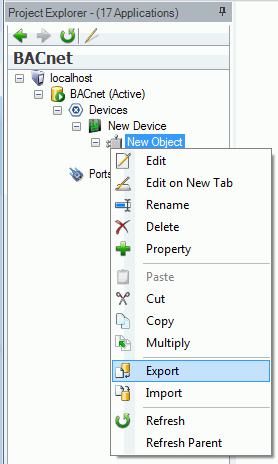 Right-click on the item from which you wish to export. This can be from the database, network, Device, Port or Object level of the BACnet Connector Project Explorer.