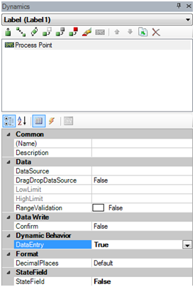 - In the ‘Dynamics’ pane, which can be found on the left side of the GraphWorX64 window by default, change the DataEntry (in the Dynamic Behavior section) property to 'True'.