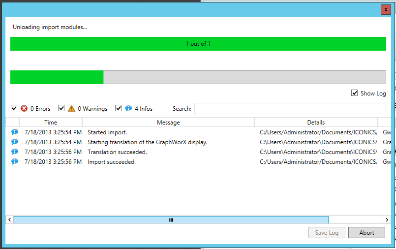 At this point, you still have the option to change the location of the root folder for the project (what you see in the navigation tree on the left side of the window) by clicking on the Change Archive button in the Operation section of the Home ribbon. If you have completed all settings, click on the Import button. The conversion process, shown below, now takes place. The top status bar relates to the number of individual elements to the 32-bit project being converted. The bottom status bar relates to the conversion of each separate element. The bottom section of the conversion window shows Errors, Warning and Info Boxes (if checked), along with the Time for each phase of the conversion, a related Message, Details and Modules. You can also elect to Abortthe conversion process at any point. You can also choose to keep a record of the process (as a .csv file) by clicking on theSave Logbutton. Close the conversion window, then the main utility window to exit the program.