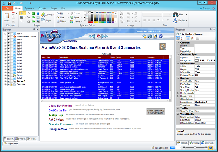 Once you've created the converted 64-bit project, you can open it as if you would any other project file. The image below shows a former 32-bit sample project that has been fully converted and opened within GraphWorX64.