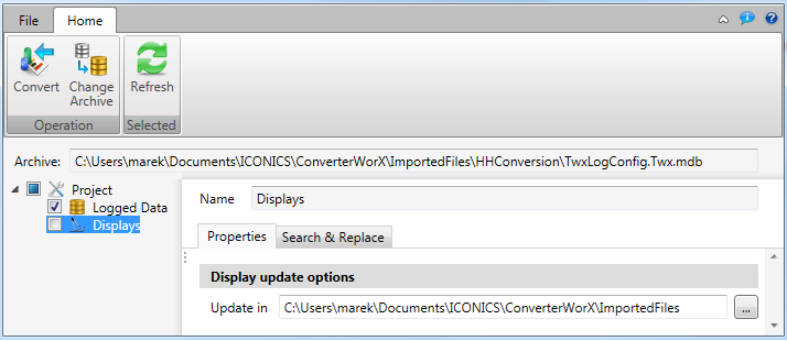 When you select Displays within the HDA2HH left-side navigation, as shown below, you can choose to update the associated displays. Click on the ellipsis [...] button to navigate to your Display's root folder. All displays associated with the originally selected Point Map File (*.cpmf) and any added through the GUI, including those in subdirectories, will be updated (via parameters within the Search & Replace tab), during the conversion process.