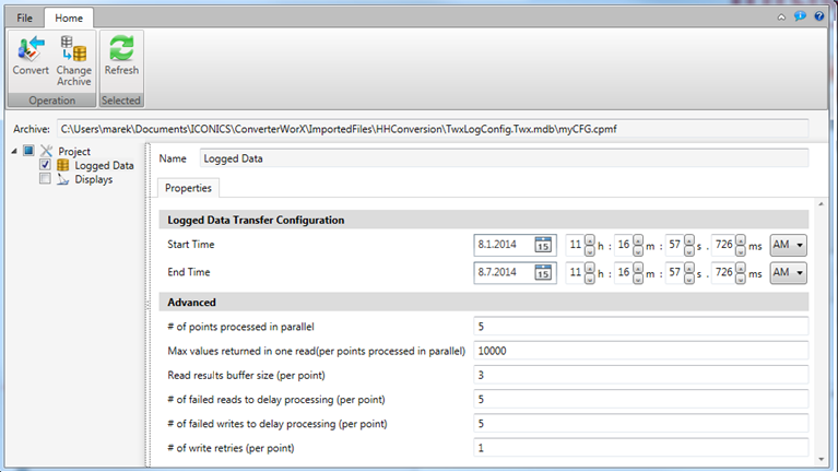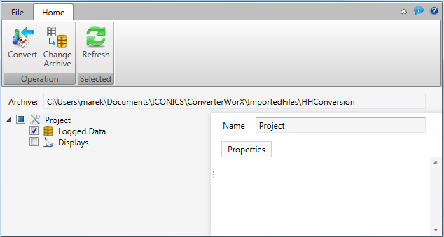 When you select a project's Logged Data within the left-side navigation field of ConverterWorX (when using the HDA2HH function), you can also set some Properties, as shown below. These include: