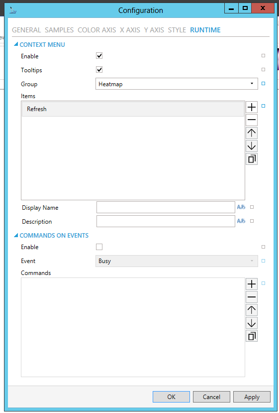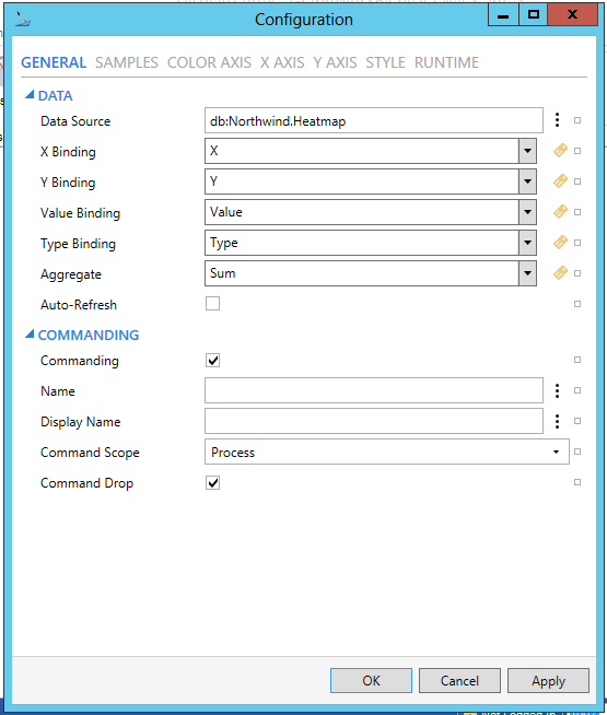 Commanding - Determines whether commands are enabled for this display. Use the CommandingName setting to specify a registration name. Click this checkbox if you intend to use Commanding with the current Heatmap control. You can also click on the