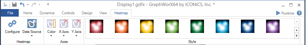 Open GraphWorX64, then click on the Controls ribbon and then on the Heatmap control. The cursor will turn into a crosshairs "+", which will allow you to draw the size of the Heatmap control you would like in the center display portion of the GraphWorX64 configuration window. Simultaneously, the GraphWorX64 ribbon will change to allow modification to the Heatmap settings.