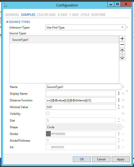 Distance Function - Distance function used to calculate values around the sample. Use {{@@value}} and {{@@distance}} placeholders for value and distance variables, for example x = {{@@value}}/{{@@distance}}. Function must return values from [Minimal Value, 1]. Enter a distance function in the text entry field or click on the