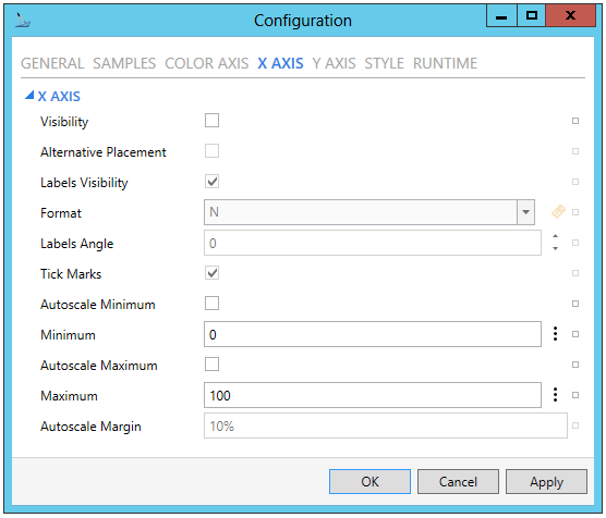 Maximum - X axis maximum value. Enter a maximum value in the text entry field or click on the