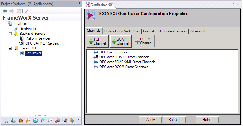 Direct channel over TCP/IP. In a direct channel over TCP/IP, the client applications communicate with GenBroker software located on remote nodes on an intranet or LAN as well as over the Internet. GenBroker communicates (locally) with the target OPC servers on behalf of the client application.