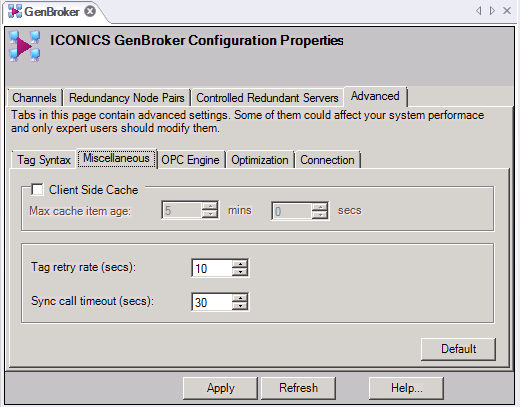 The Advanced tab's Miscellaneous sub-tab, shown below, contains settings for the client-side cache and its refresh rates and synchronization feature.
