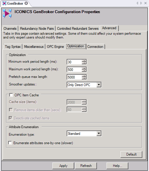 Smoother Updates: When GenBroker is idle, it can prepare updates in advance. As a result, it sends more updates to the client and runs more smoothly. But this also means more traffic over the network and more CPU utilization. If you want GenBroker to prepare updates in advance, select Always or Only Direct OPC from the Smoother Updates drop-down list. In the Prefetch Queue Max Length specify the limit to the number of updates prepared in advance. If you don’t want to use this feature, select None from the Smoother Updates drop-down list.