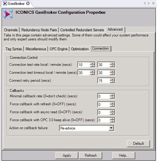 Callbacks section: Use the options in this section only if you are using Windows on your clients and servers. When the client gets OPC data using DCOM, the OPC server creates a callback connection to the client that it uses to notify the client of value changes; conditions in a Windows server environment may prevent the client from checking the callback status using the settings in the Connection Control section, so it is important that you use these settings to test the callback connection. Use options in this section to detect and repair failed callbacks from the OPC server to the client if you are running Windows.