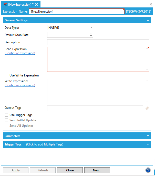In the General Settings section of the window, specify the Data Type, Default Scan Rate, and Description (described in detail below in Expression Properties).