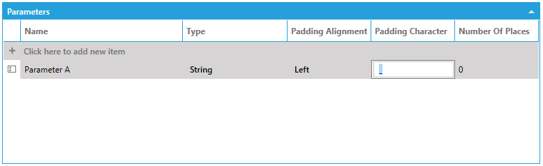 You can opt to expand the Parameters section via the triangle in the right side of the section. Click on the plus button [+] to add a new item. You can add a Name for the parameter, as well as Type (via pulldown menu, selecting either Number or String), Padding Alignment (None, Left or Right), Padding Character, and Number of Places.