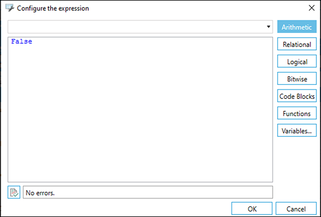 Each button in the Expression Editor displays a list of available functions. For example, the Variables button displays a list of defined inputs you can use in an expression. Variables require curly brackets within the syntax of the expression. For example: {{DataSource}} >= {{HiValue}}. With this editor, you can build an expression and then use the check syntax button (bottom left) to check your expression syntax, but it does not check whether the expression is correctly applied.