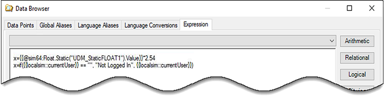 - Variables - opens the Data Browser containing a list defined inputs you can use in an expression. Variables require curly brackets within the syntax of the expression. Refer to Data Type Conversion and Point Extension System (PES).