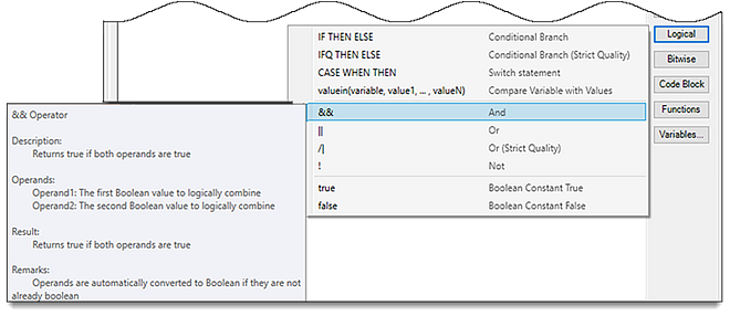 extension syntax. The expression editor provides buttons to assist you in writing expressions using the proper syntax. For example, click the Logical button to show available selections. Hover over a function to display descriptive tooltips.