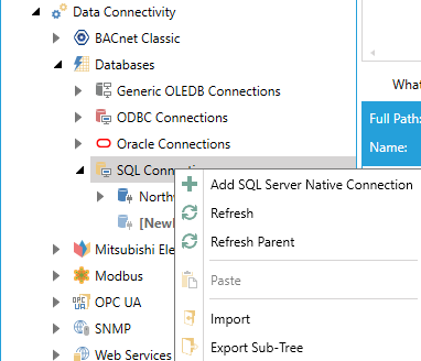 Right-click one of the listed connections folders (Generic OLEDB Connections, ODBC Connections, Oracle Connections, or SQL Connections), then select Add [SQL Server Native Connection]. In this example, we will create a new database connection within the SQL Connections folder. You could perform this same action for an Oracle connection, etc.