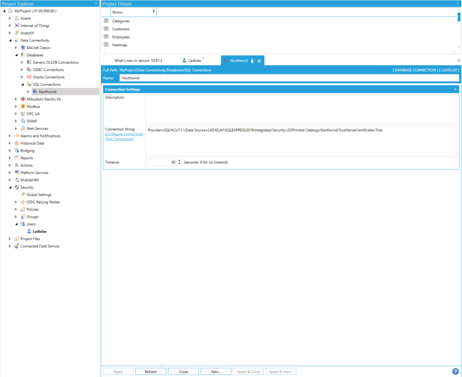 Open the Workbench. Expand your project folder, then the Data Connectivity node, then the Databases node. Expand the folder of your selected database connection and then click on your desired connected database (see the bulleted list above for options). For instance, in the following image, we've expanded the SQL Connections folder to select the Northwind database. Once selected, you can view/edit the database connection's settings, as shown below.