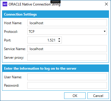 In Connection String, you can click on the Configure Connection link, which will open the Oracle Native Connection String window, similar to the one shown below. Once you have entered the requested info, click OK to return to the connection properties.