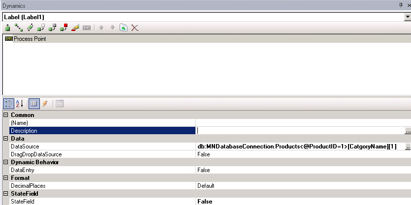 - When you click on the Process Point, the Dynamics panel appears with Label categories. Manually change the Data Source name to pick the exact item in the table that you want to display in the process point. To do this, first add the column index or column name in square brackets, followed by the row index in square brackets (indices are zero-based). In the following example, column one, row one are being displayed from the Products data source.
