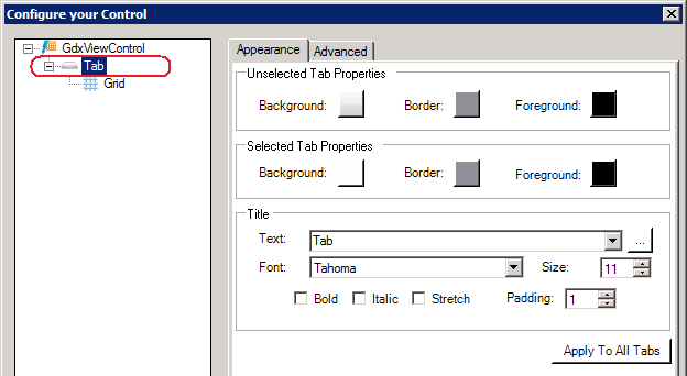 Appearance Tab for a GridWorX tab