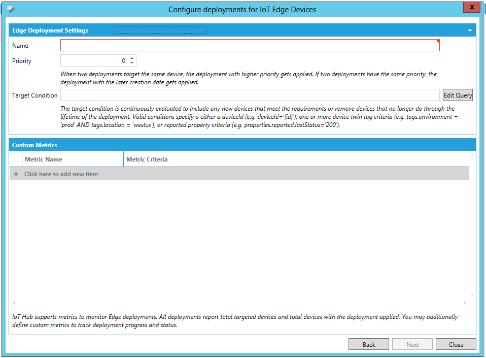 NOTE: IoT Hub supports metrics to monitor Edge deployments. All deployments report total targeted devices and total devices with the deployment applied. You may additionally define custom metric to track deployment progress and status.