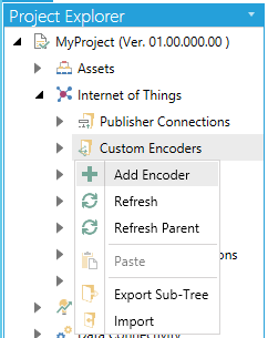 In the Workbench, expand a project and the expand the Internet of Things node. Right-click on the Custom Encoders/Decoders node, as shown below, and then click on Add Encoder/Decoder.