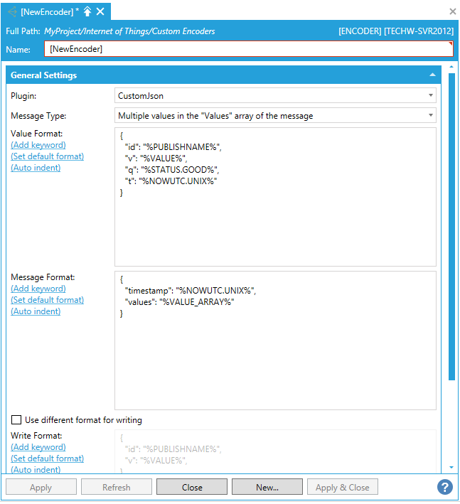 Value Format - Enter the value format in the text entry field. Sample text is provided to demonstrate the syntax. Click on the Add keyword link to open the Custom JSON Encoder Format Keywords in order to select a keyword for the custom format for each property (Value, Message, Write). Click on the Set default format link to reset back to the default format shown. Click on Auto indent to automatically indent the message text.