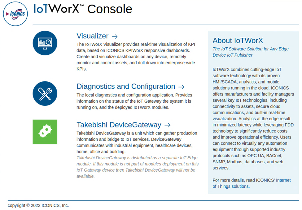 The IoTWorX Console is the starting point to the applications available locally on the IoT device. The IoTWorX Console is split between the "Visualizer", "Diagnostics and Configuration", and "Takebishi DeviceGateway“.