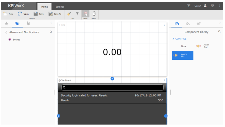 Drag Events into the unoccupied part of the dashboard. You will see an alarm list widget automatically created subscribed to GenEvents.
