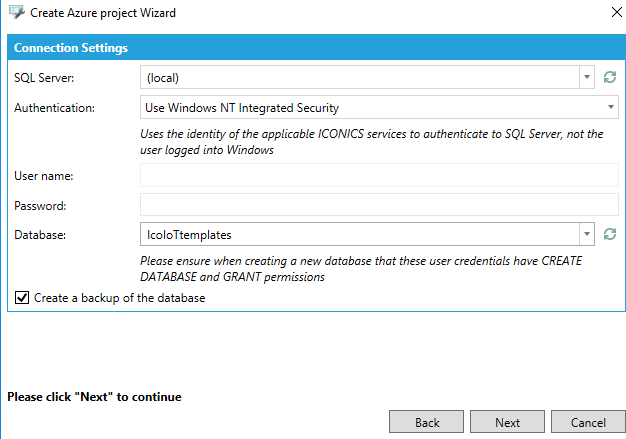 Select your SQL Server, then enter the name of a NEW database where we will store the template configuration for our devices.