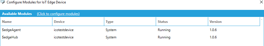 On the next screen, you will see the status of the Edge modules running on the device. Click the Click to configure modules link in the Available Modules header.